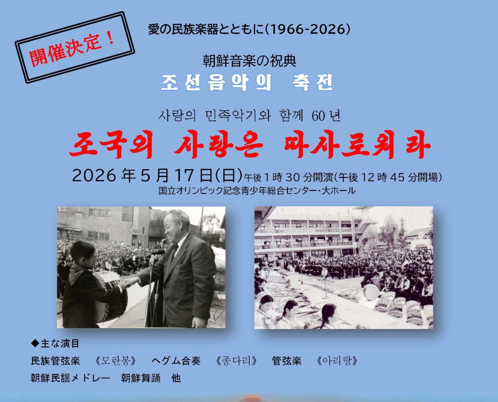 〈チケットは、2月16日から販売!〉愛の民族楽器とともに60年(1966-2026)朝鮮音楽の祝典『祖国の愛はあたたかく』(2026.5.17)