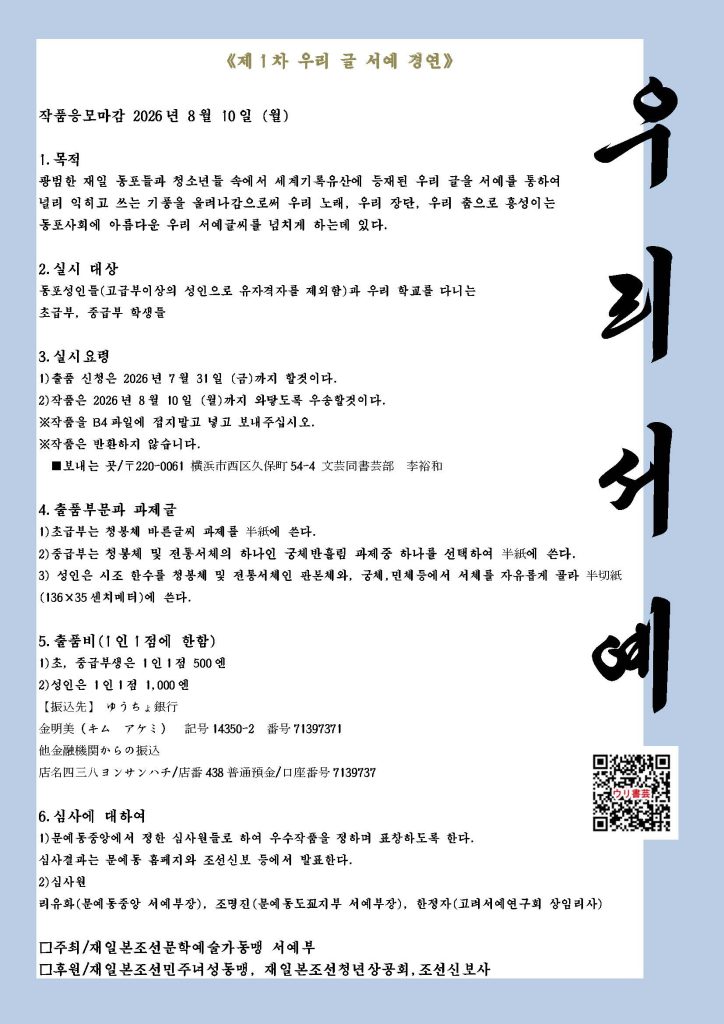 광범한 재일 동포들과 청소년들 속에서 세계기록유산에 등재된 우리 글을 서예를 통하여 널리 익히고 쓰는 기풍을 올려나감으로써 우리 노래, 우리 장단, 우리 춤으로 흥성이는 동포사회에 아름다운 우리 서예글씨를 넘치게 하는데 있다.