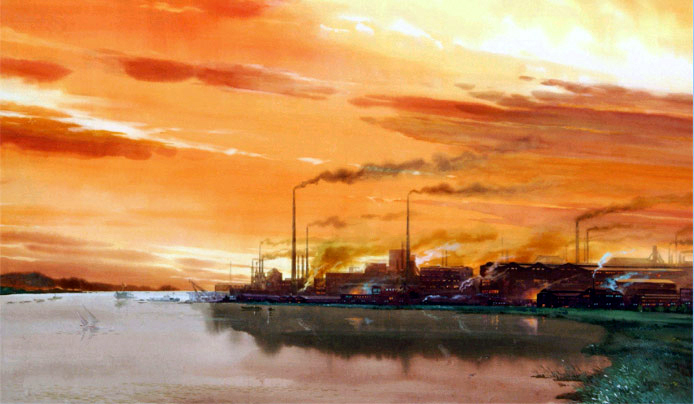 저녁하늘을 물들이며 타오르는 노을빛처럼 용해장에서 빛발쳐나오는 붉은 쇠물빛은 창조와 혁신, 기적으로 들끓는 로동계급의 강의한 정신력을 상징적으로 펼쳐보인다.