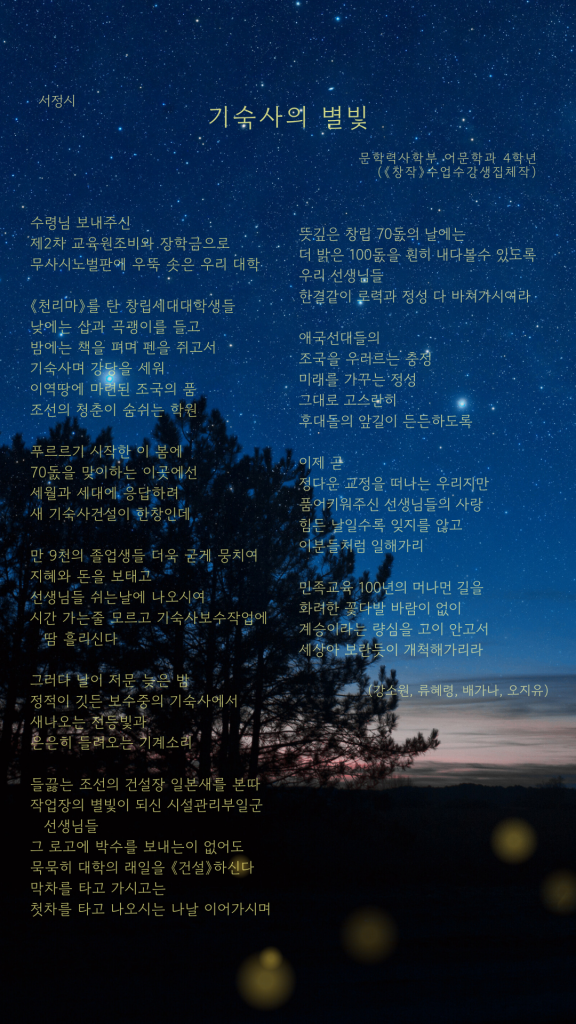 서정시 《기숙사의 별빛》어문학과 4학년, (《창작》수업수강생집체작)