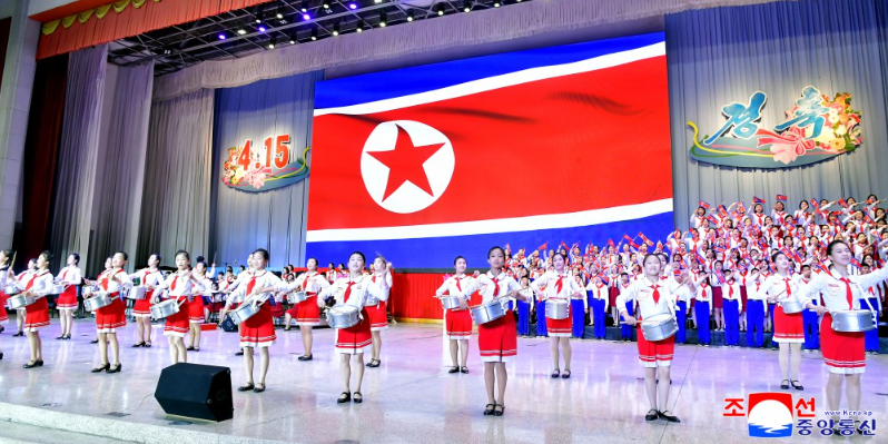 위대한 수령 김일성대원수님 탄생 114돐경축 평양학생소년궁전 예술소조원들의 종합공연 《원수님 계시여 영원한 봄명절》이 13일 평양시청년공원야외극장에서 진행되였다.