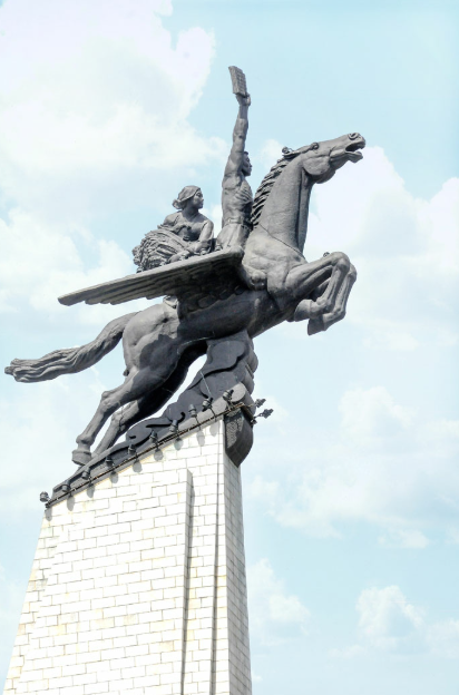 1959년 4월 당시 모란봉 경상골의 청년공원건설장을 현지지도하시던 위대한 수령님께서는 만수대언덕에 천리마시대를 상징하는 기념탑을 하나 세워야겠다고, 동상은 말같은것을 형상하는것이 좋겠다고 하시였다.