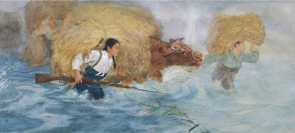 조선화 《남강마을의 녀성들》은 1966년에 김의관이 창작한 작품이다.